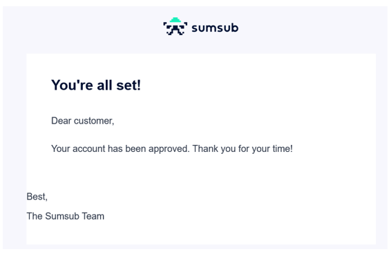 You will receive an email from Sumsub confirming that your account has been approved.